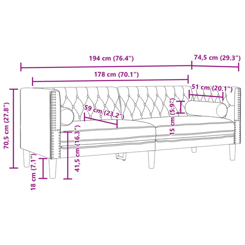 Diese Chesterfield-Sofas bietet den idealen Platz zum Plaudern, Lesen, Fernsehen oder einfach nur zum Entspannen. Die Sofagarnitur wird ein echter Blickfang in deinem Zuhause sein. Weiches und komfortables Material: Der Samtstoff hat eine weiche und sanfte Oberfläche, die sich angenehm auf der Haut anfühlt und höchsten Komfort bietet.Bequemes Sitzerlebnis: Dank der dick gepolsterten Sitzflächen, Armlehnen und Rückenkissen ist das Sofa sehr bequem. Die im Lieferumfang enthaltenen Nackenrollen verschönern nicht nur deine Einrichtung, sondern werden auch zusätzlichen Sitz- und Liegekomfort bieten.Chesterfield-Stil: Mit dem klassischen Rückenlehne und den Armlehnen mit Knopftuft und einer einheitlichen Rücken- und Armhöhe wertet das Sofa jeden Wohnraum auf und bietet sowohl Stil als auch Komfort.Stützbeine: Der Polstersessel wird von stabilen Beinen getragen, die seine Stabilität und Standfestigkeit gewährleisten.